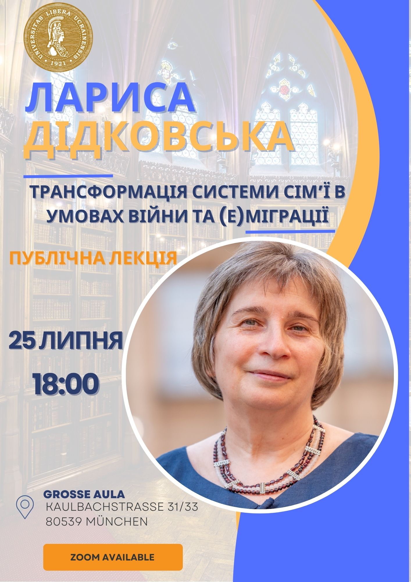 25 липня о 18:00 відбудеться публічна лекція ректорки УВУ проф. Лариси Дідковської “Трансформація системи сім’ї в умовах війни та (е)міграції”.
