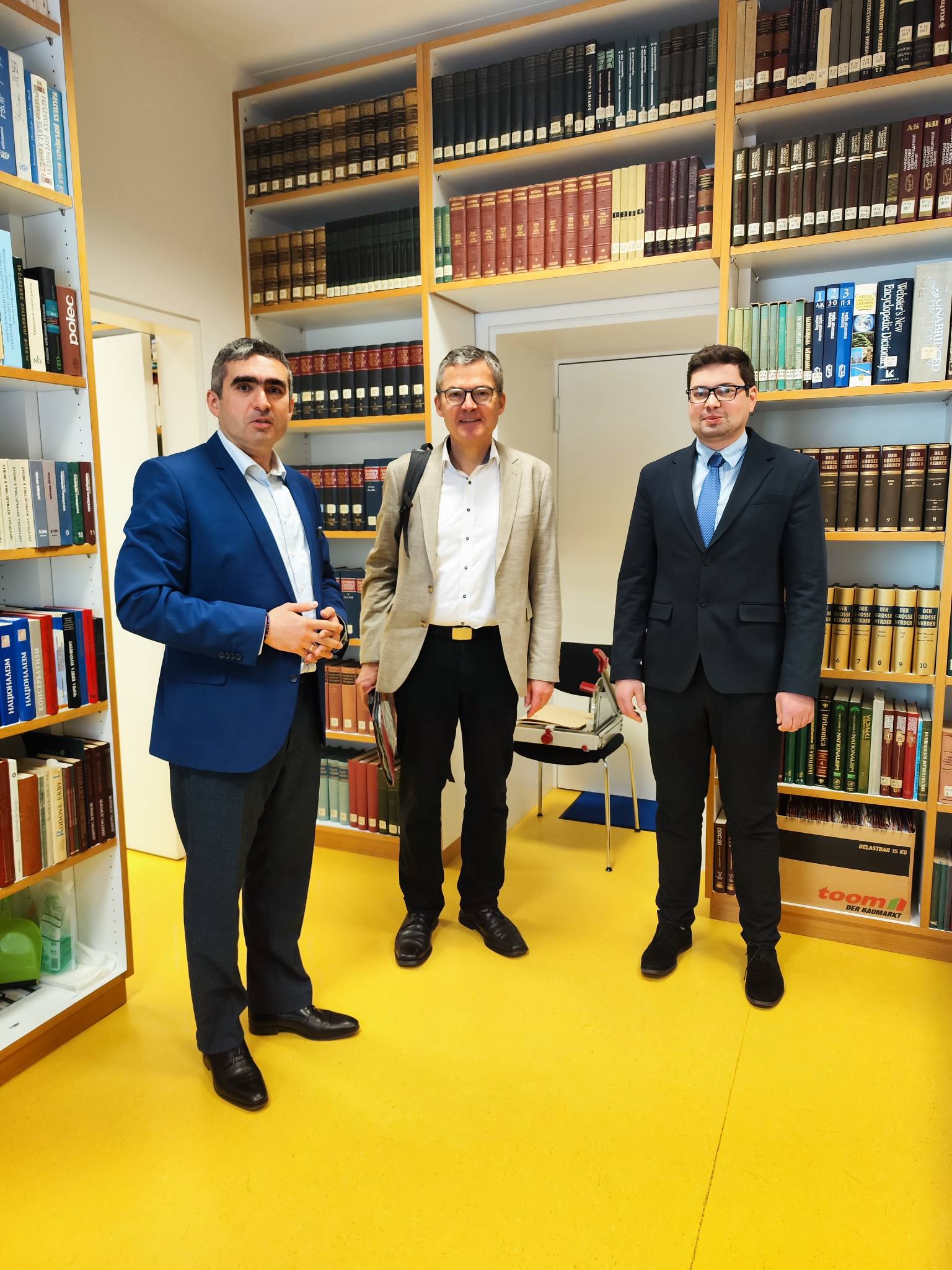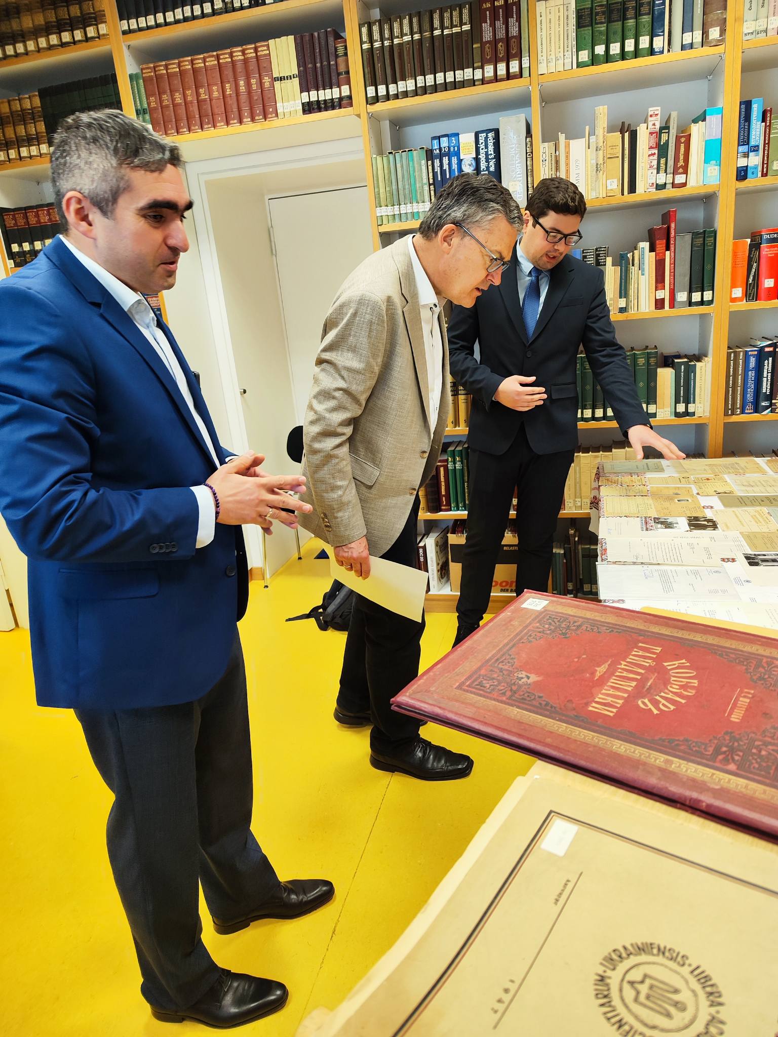 Der Kanzler der Ukrainischen Freien Universität, Dmytro Shevchenko, und Referent Dr. Roman Tyutenko führten den Gast durch die Räumlichkeiten der Universität. Anhand einzigartiger Archivdokumente, Publikationen der Diaspora aus den Jahren 1910–1950 sowie Beständen des Kunstfonds skizzierten sie die bewegte Gründungs- und Entwicklungsgeschichte der Ukrainischen Freien Universität.