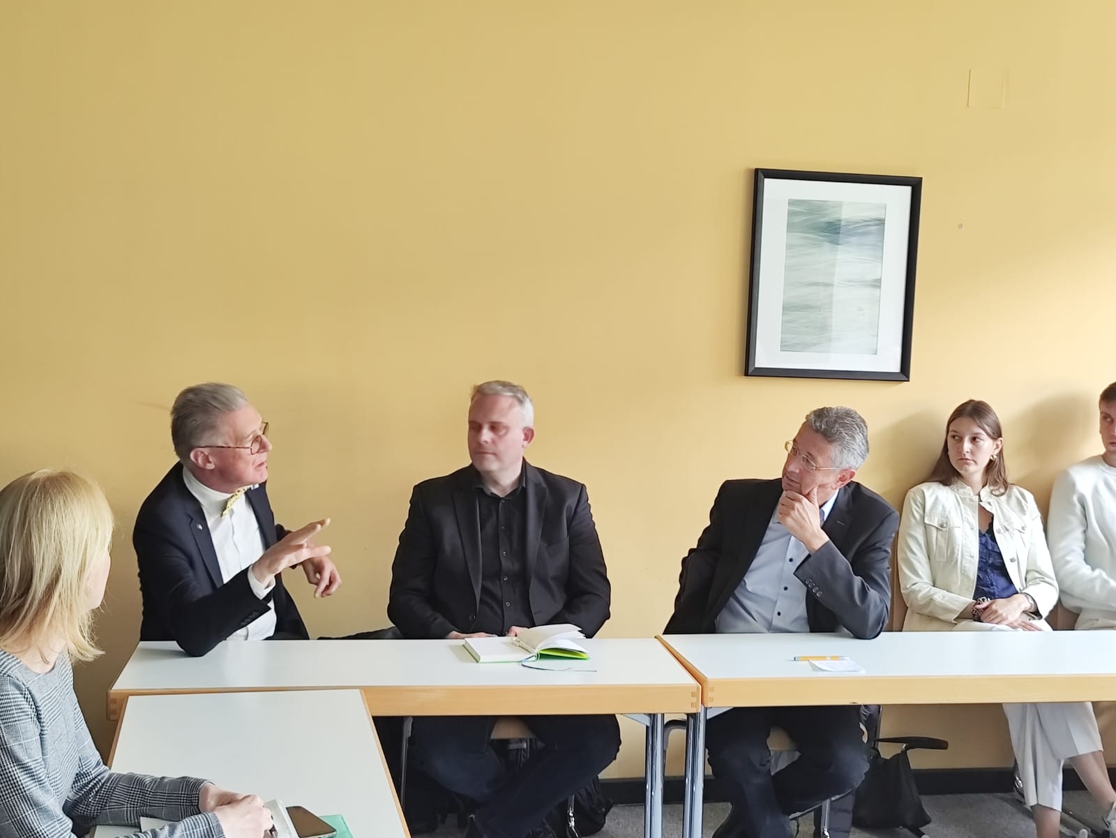 Prof. Dr. Piazolo besichtigte die von der UFU genutzten Räumlichkeiten in der Hochschule für Philosophie, welche die Durchführung hybrider Lehrveranstaltungen ermöglichen, was für den Teil der rund 420 UFU-Studierenden wichtig ist, der die Ukraine wegen des Krieges nicht verlassen darf. Der Ausschussvorsitzende tauschte sich mit den Studierenden über die Besonderheiten des akademischen Prozesses an der UFU aus sowie ihre Zukunftspläne in Deutschland und der Ukraine.