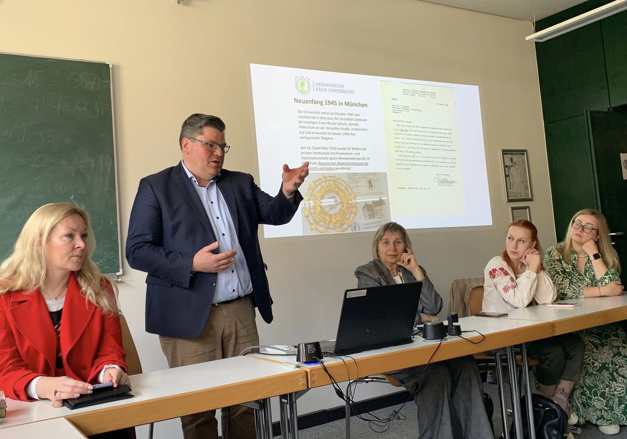 UFU-Beirat Dieter Rippel führte mit einer Präsentation ein in Geschichte und Gegenwart der UFU ein und beleuchtete ihre Bedeutung in Wissenschaft und Lehre als einzige Exiluniversität außerhalb der Ukraine. Zahlreiche Projekte wie etwa auch die Kooperation mit der Universität Regensburg sowie der Europa-Universität Viadrina Frankfurt a.d.O. wurden ebenso vorgestellt wie auch das aktuelle Vorhaben der systematischen wissenschaftlichen Zugänglichmachung des bedeutungsvollen historischen Archivs durch Digitalisierung in Kooperation mit dem Digitalen Forum Mittel- und Osteuropa e.V. (kurz: DiFMOE e.V.).
