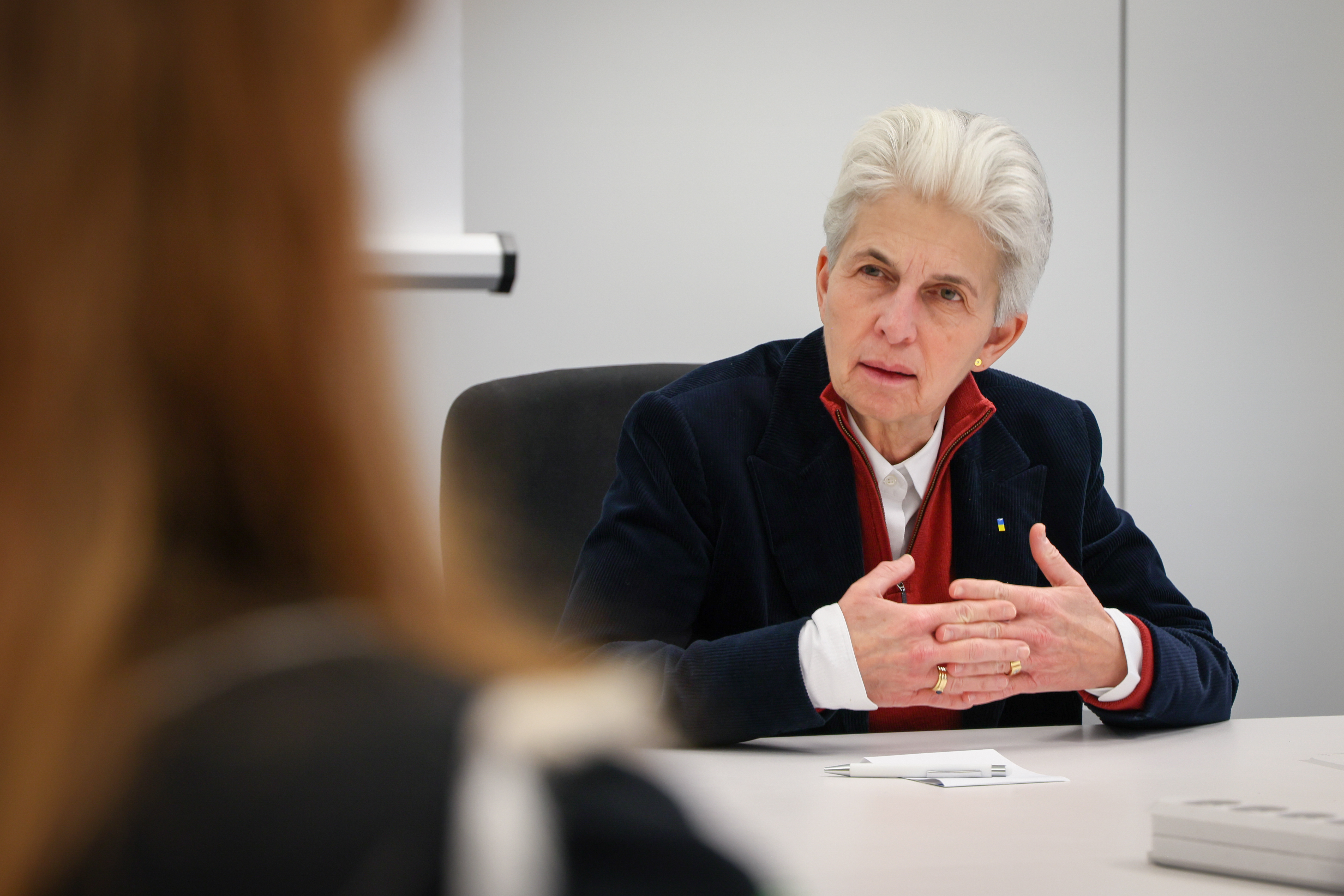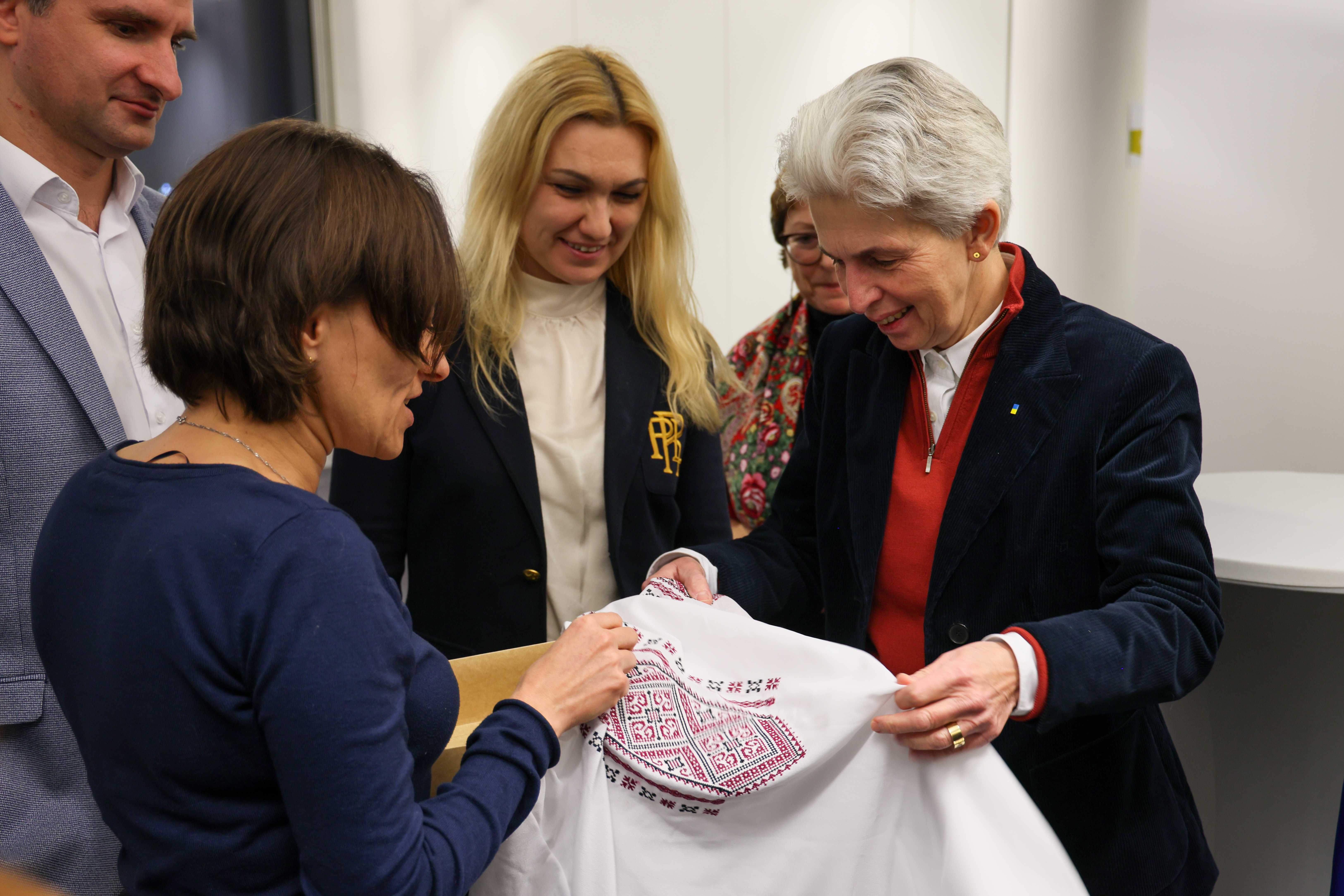 Im Hauptgebäude der UFU stellte Peter Hilkes exemplarisch besondere Schätze aus dem Archiv vor. Die UFU bewahrt hier Publikationen und Aufzeichnungen aus über 100 Jahren Diaspora auf. Insbesondere die Druckerzeugnisse aus den DP-Camps ab 1945/46 sind nahezu einzigartig. Dr. Strack-Zimmermann, die seit ihrer Studienzeit enge Beziehungen zu München pflegt, erfuhr, dass die heutige Diaspora maßgeblich aus dieser Zeit herrührt. Sie selbst betonte vor diesem Hintergrund die Bedeutung der Universität als wissenschaftliches Bindeglied zwischen der Ukraine und Deutschland.