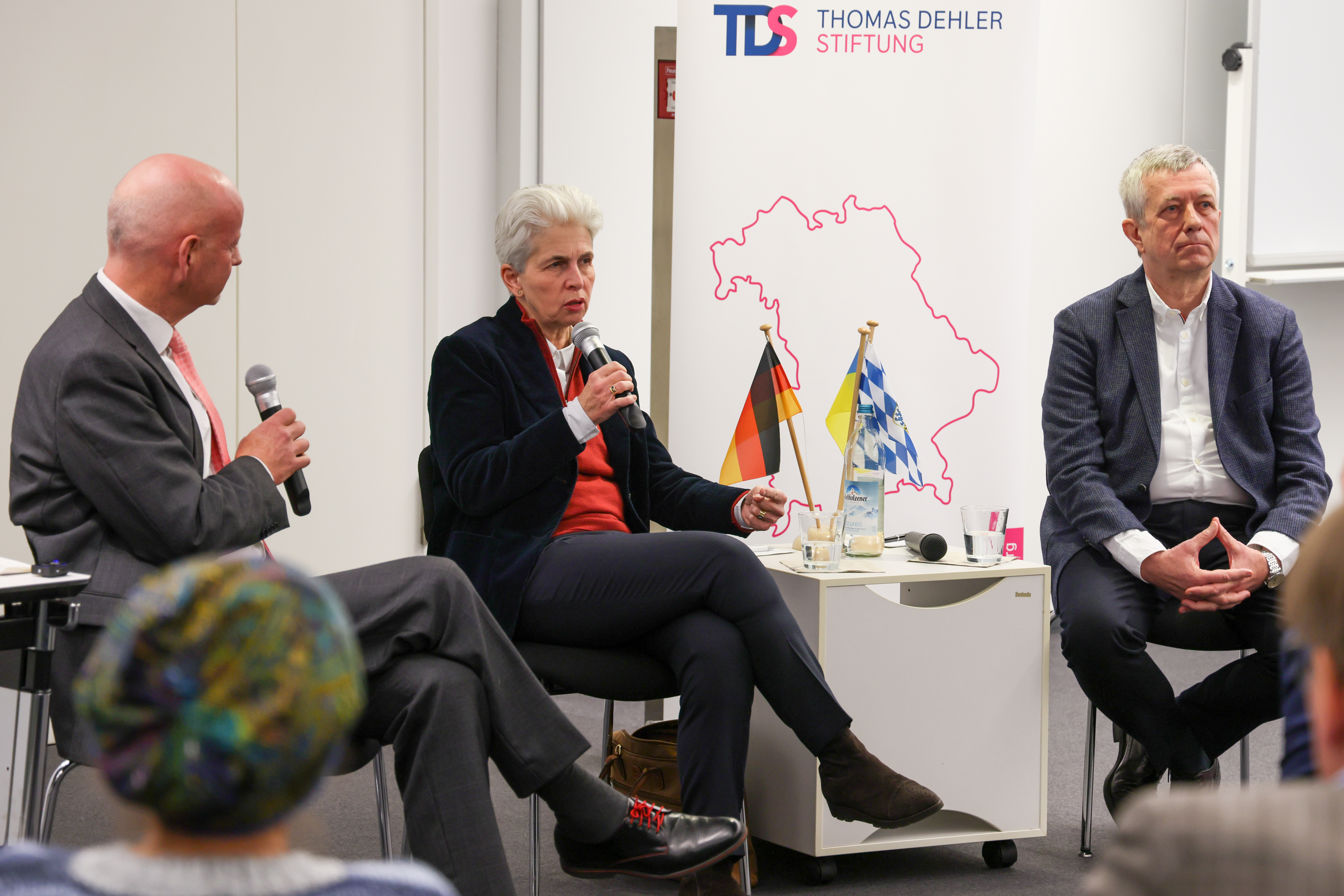 Den Höhepunkt des Besuchs stellte eine abendliche Veranstaltung auf Einladung und in Kooperation mit dem Münchner Büro der Friedrich-Naumann-Stiftung/Thomas-Dehler-Stiftung dar. Zur Podiumsdiskussionsrunde „Die Zukunft der Ukraine und die Verantwortung Deutschlands“ kamen im Rahmen einer Podiumsdiskussion mit dem Generalkonsul der Ukraine in München Yuriy Yarmilko und Dr. Marie-Agnes Strack-Zimmermann unter Moderation des Regensburgers Politikwissenschaftlers Prof. Dr. Stephan Bierling rund 100 Teilnehmende zusammen. Im rund 90-minütigen Austausch wurde die Wichtigkeit der Unterstützung auf dem militärischem Sektor zur Selbstverteidigung der Ukraine ebenso klar herausgearbeitet wie auch die Wichtigkeit einer deutschen Rolle in einem europäischem Kontext.