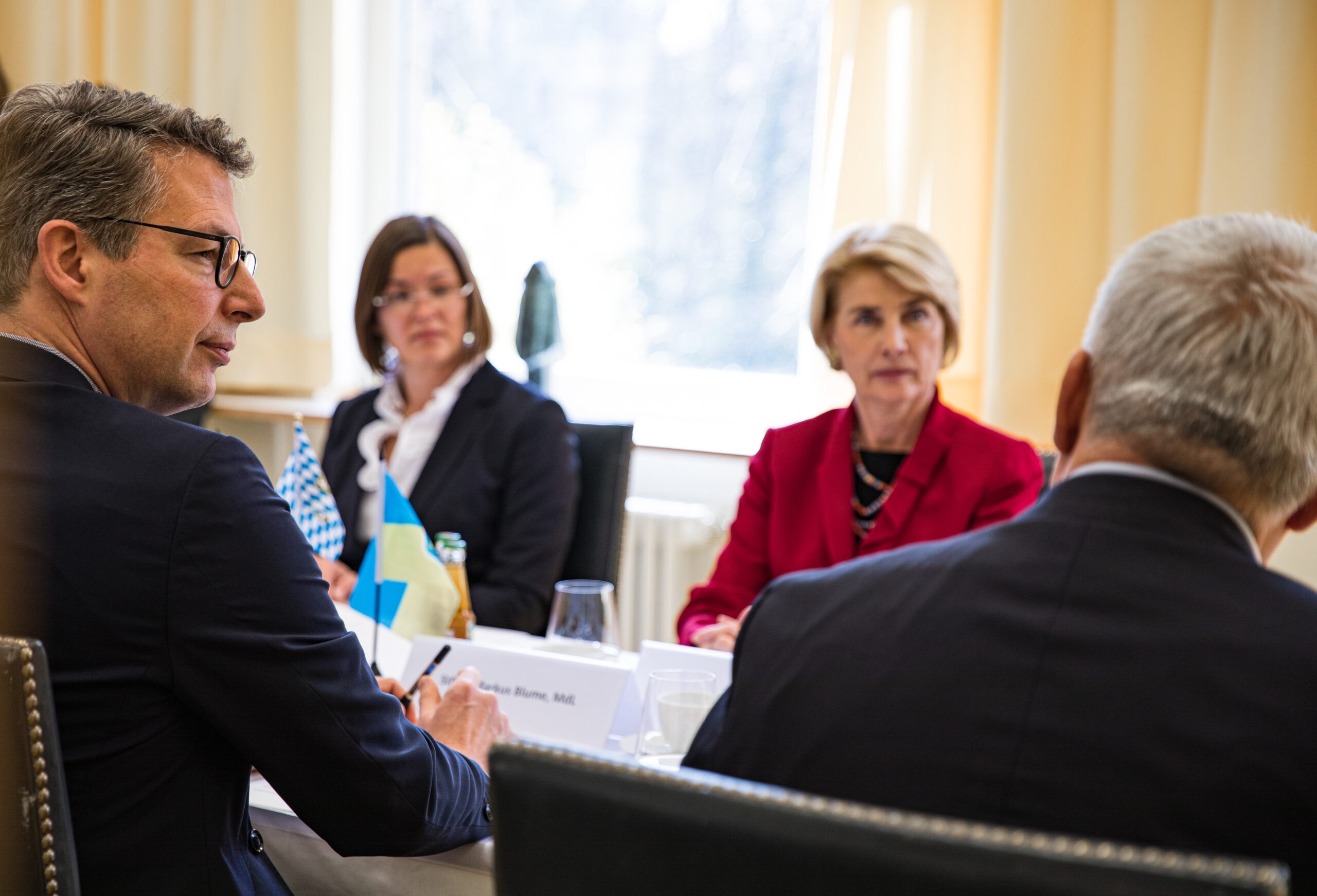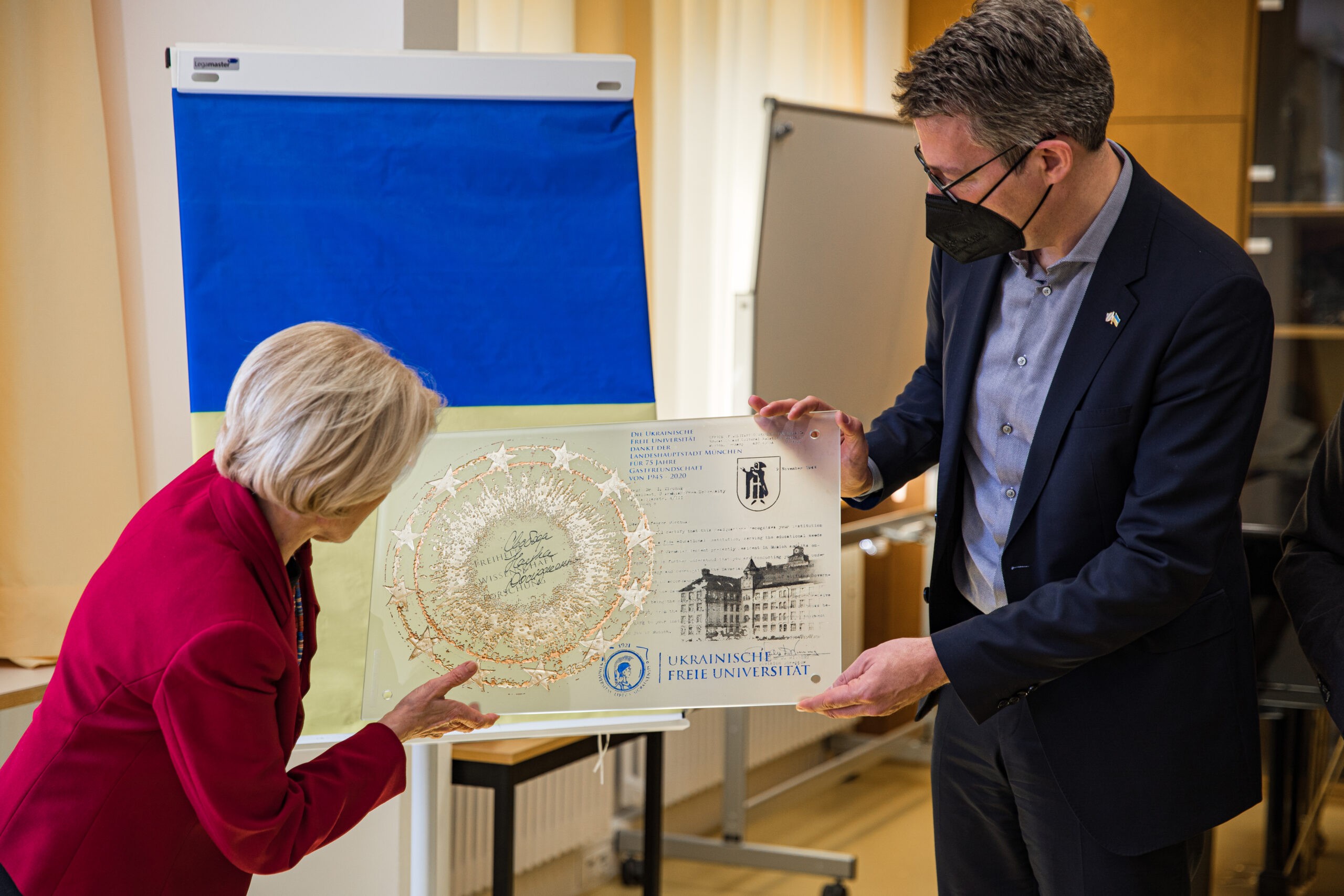 m Montag, 21. März besuchte Wissenschaftsminister Markus Blume, MdL, zusammen mit dem früheren Staatsminister Dr. Ludwig Spaenle, MdL, die private Ukrainische Freie Universität (UFU) in München-Nymphenburg, um sich über die aktuelle Situation und die Auswirkungen des Krieges auf die Universität zu informieren. Im Gespräch mit Studierenden gewannen beide erste Eindrücke über die persönliche, z. T. nicht leichte Situation. Bei dem sich anschließenden Austausch mit der Universitätsleitung informierten Rektorin Prof. Dr. Maria Pryshlak, Kanzlerin Yanina Lipski sowie Beirat Dieter Rippel näher über die aktuellen Herausforderungen und Anliegen. Infolge der Flucht vor dem Krieg seien v.a. viele Studentinnen aus der Ukraine nach München zurückgekehrt, z. T. mit fast nichts in der Hand. Diese benötigten Räume zum Leben sowie Computer zum Lernen.