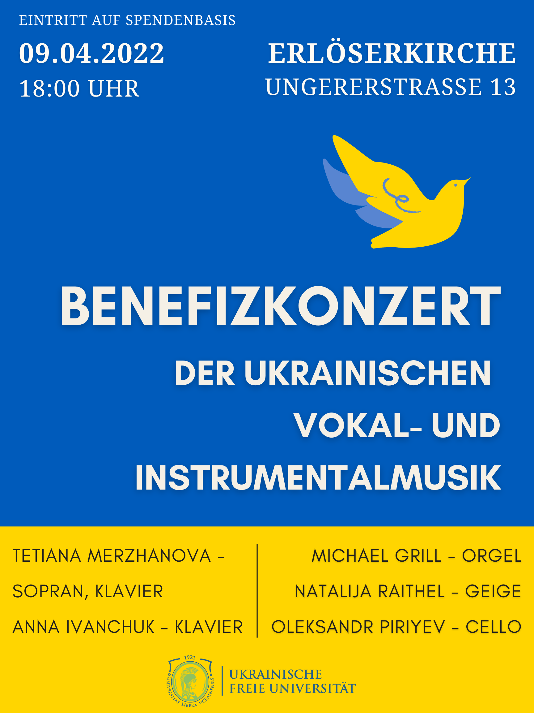 Запрошуємо Вас на благодійний концерт, який відбудеться в суботу 9 квітня о 18:00 в Церкві спасителя (Erlöserkirche, Ungererstrasse 13). Вхід на основі пожертв. За кошти, отримані з бенефісу, буде придбано захисне обладнання для української армії.