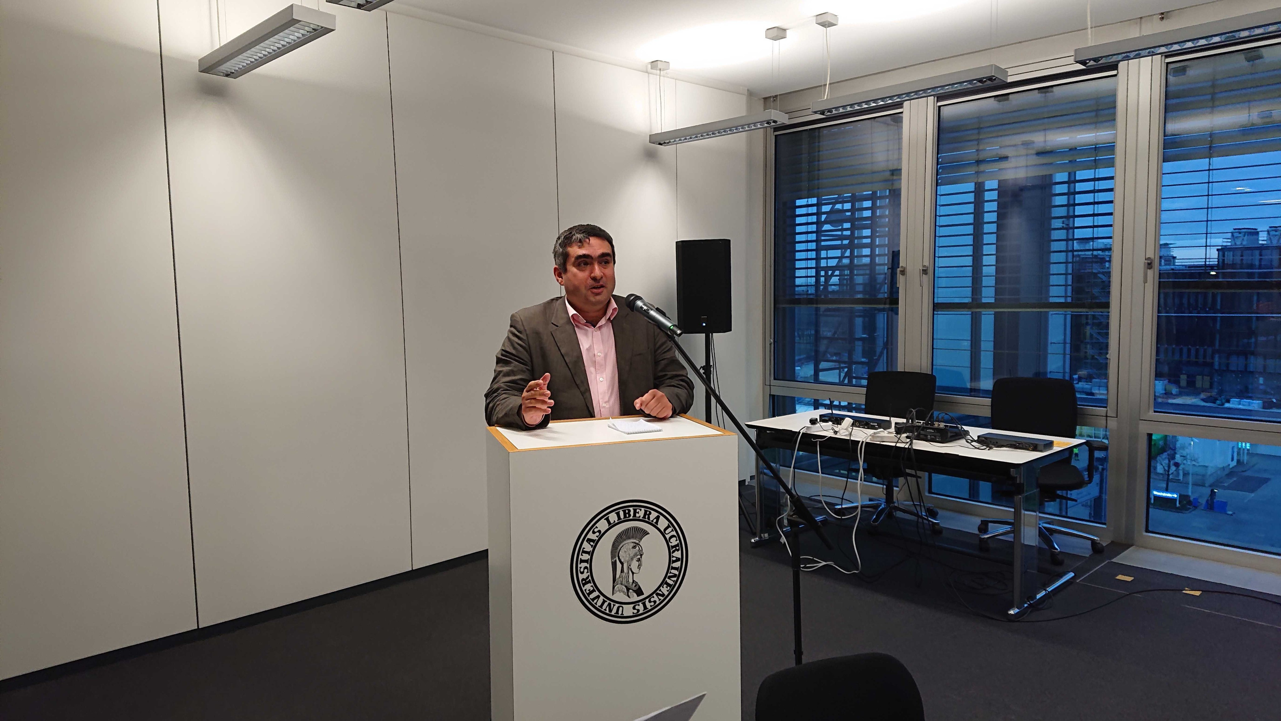 UFU-Kanzler Dmytro Shevchenko begrüßte alle Beteiligten und die über 100 Zuhörerinnen und Zuhörer in den Räumen der UFU am Münchner Tor.
