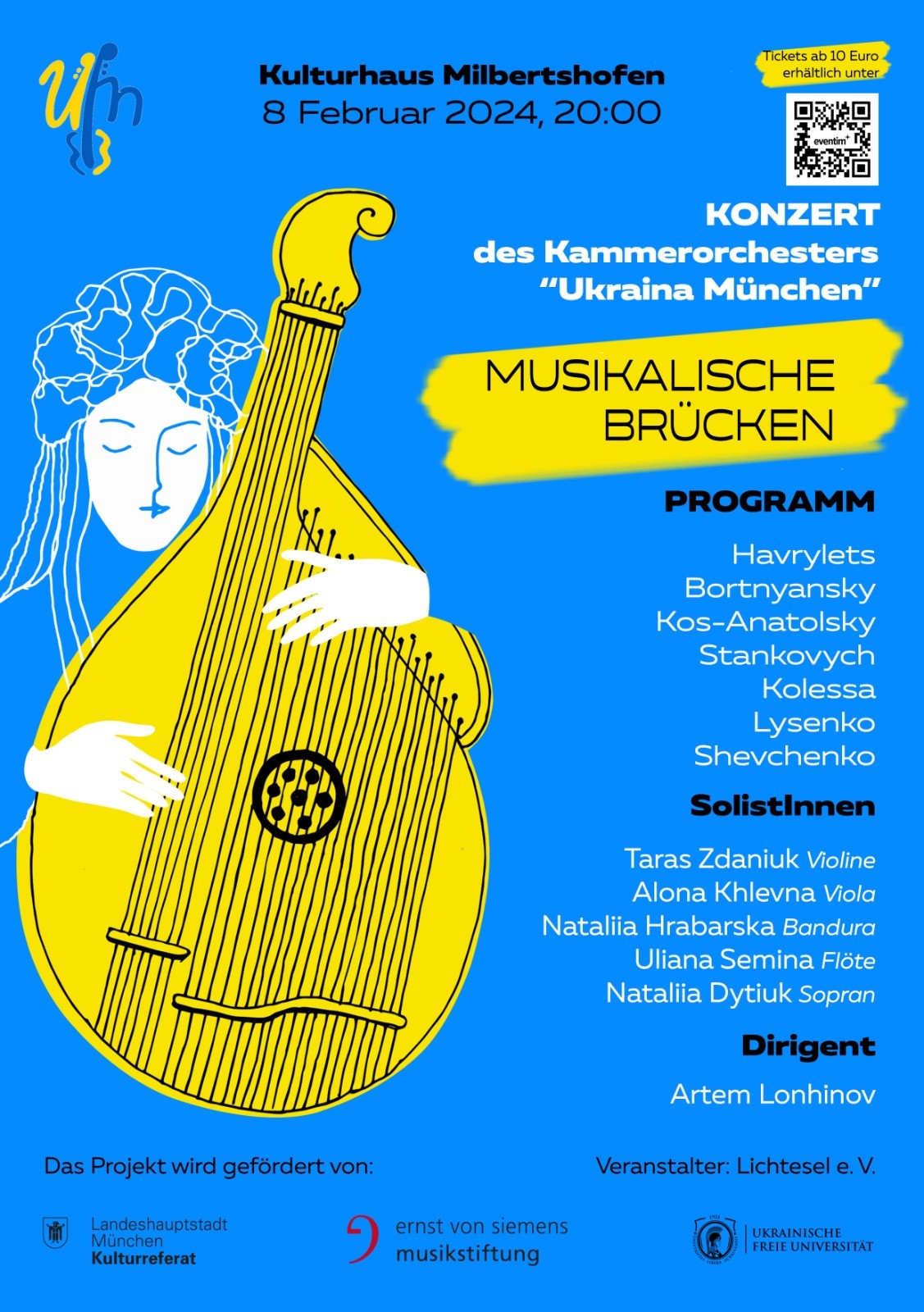 Am 8. Februar um 20:00 Uhr findet ein Konzert des Kammerorchesters “Ukraina München” „Musikalische Brücken: SolistInnen-Gala“ im Kulturhaus Milbertshofen statt.