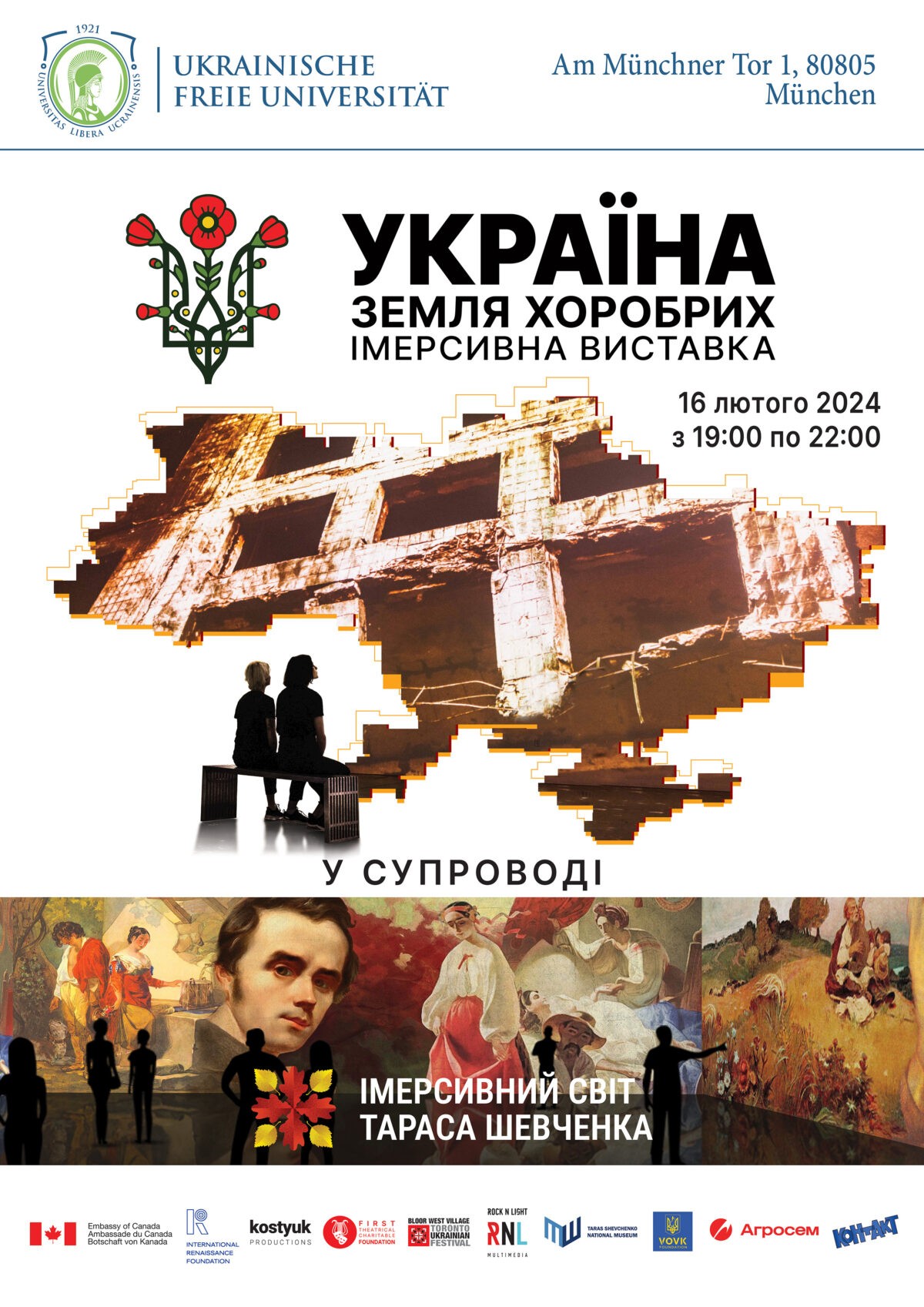 On the occasion of the second anniversary of the full-scale invasion of Ukraine by Russia, Ukrainische Freie Universität and the Embassy of Canada to Germany will host the internationally renowned multimedia exhibition “Ukraine:Land of the Brave”, accompanied by “Immersive Shevchenko: Soul of Ukraine”