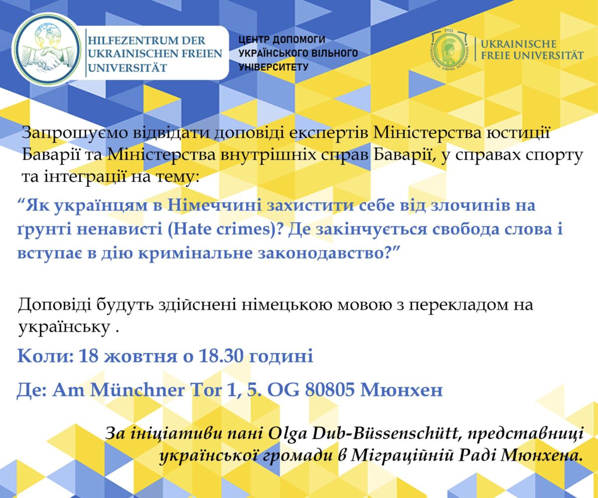 18 жовтня 2022 року в УВУ відбувся інформаційний захід на тему «Як українцям в Німеччині захистити себе від злочинів на ґрунті ненависті (Hate crimes)? Де закінчується свобода слова і вступає в дію кримінальне законодавство?».
