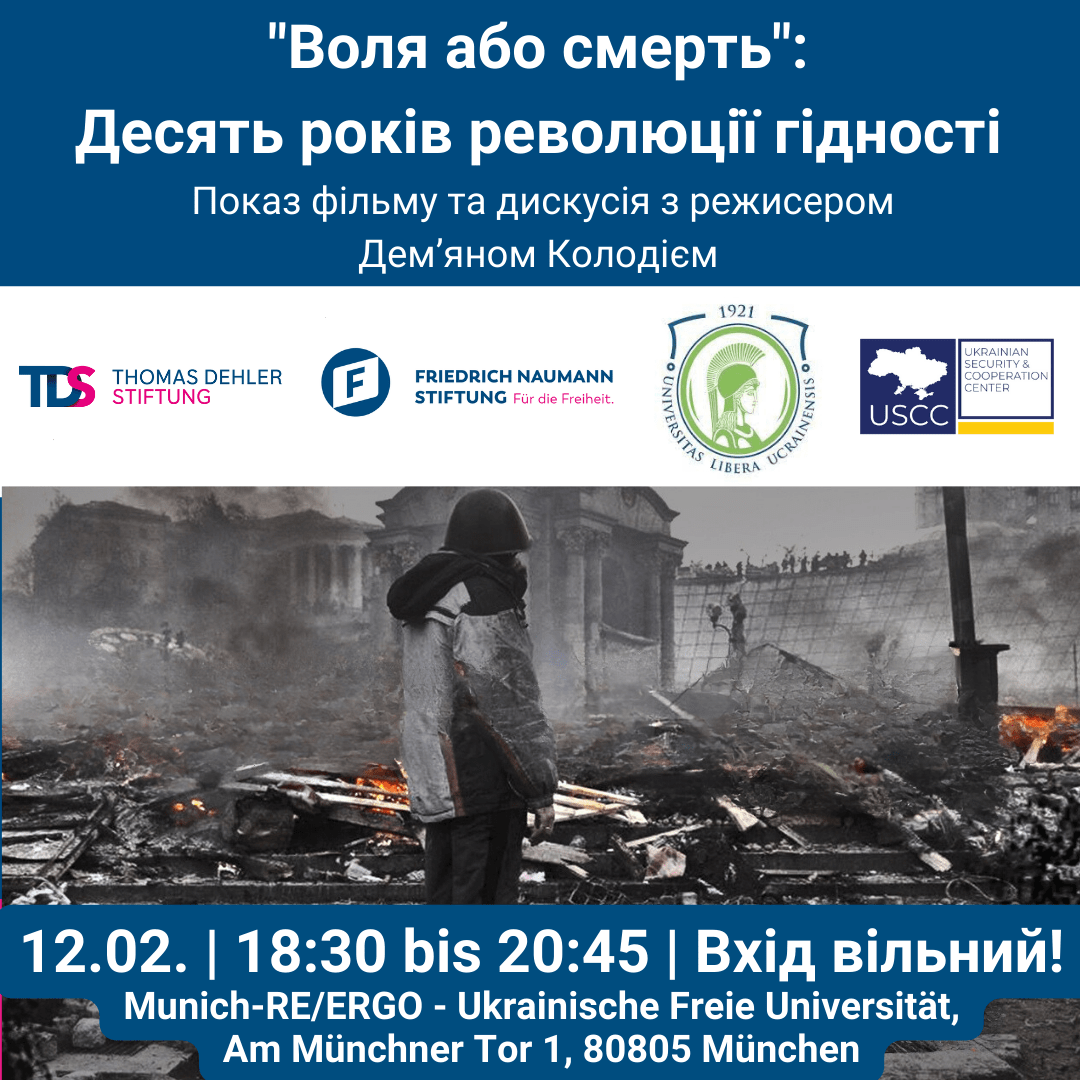 Спільно з фондом Наумана i фондом Делера запрошуємо 12 лютого 2024 р. на захід "Воля або смерть: Десять років Революції гідності". У рамках заходу відбудеться показ фільму та дискусія з американсько-українським режисером Дем'яном Колодієм.