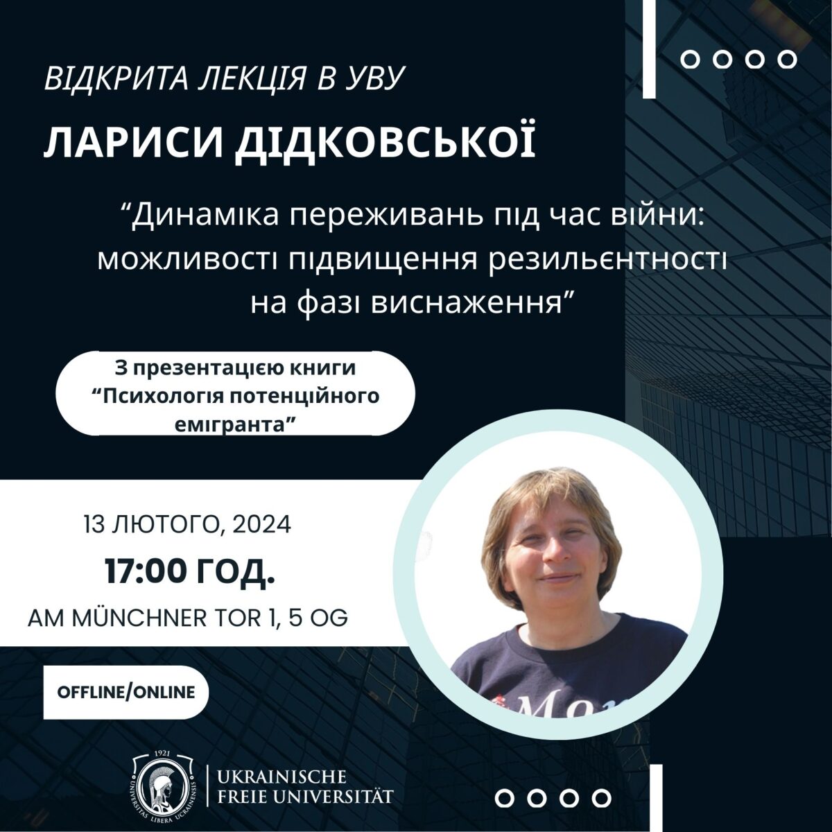 У вівторок, 13 лютого, запрошуємо Вас на відкриту лекцію психотерапевтки, психолога, деканки Філософського факультету УВУ, проф. Лариси Дідковської на тему "Динаміка переживань під час війни: можливості підвищення резильєнтності на фазі виснаження".