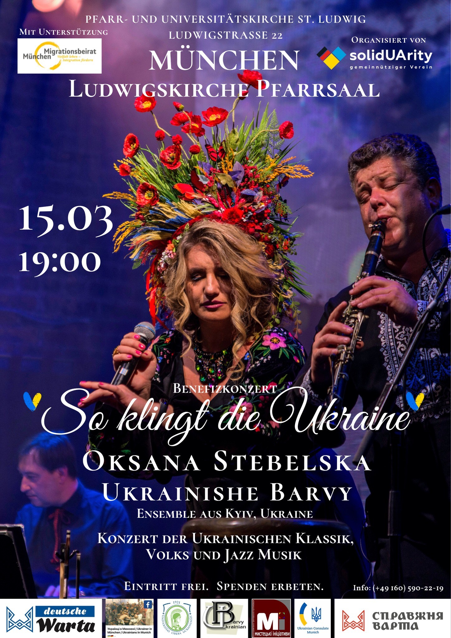 15 березня у Мюнхені відбудеться унікальна музична подія – «Так звучить Україна!» (So klingt die Ukraine). Концертна програма за участі заслуженої артистки України, відомої волонтерки Оксани Стебельської та київського колективу «Українські Барви» – це унікальний музичний продукт, що демонструє усе розмаїття українського музичного мистецтва в одній події.