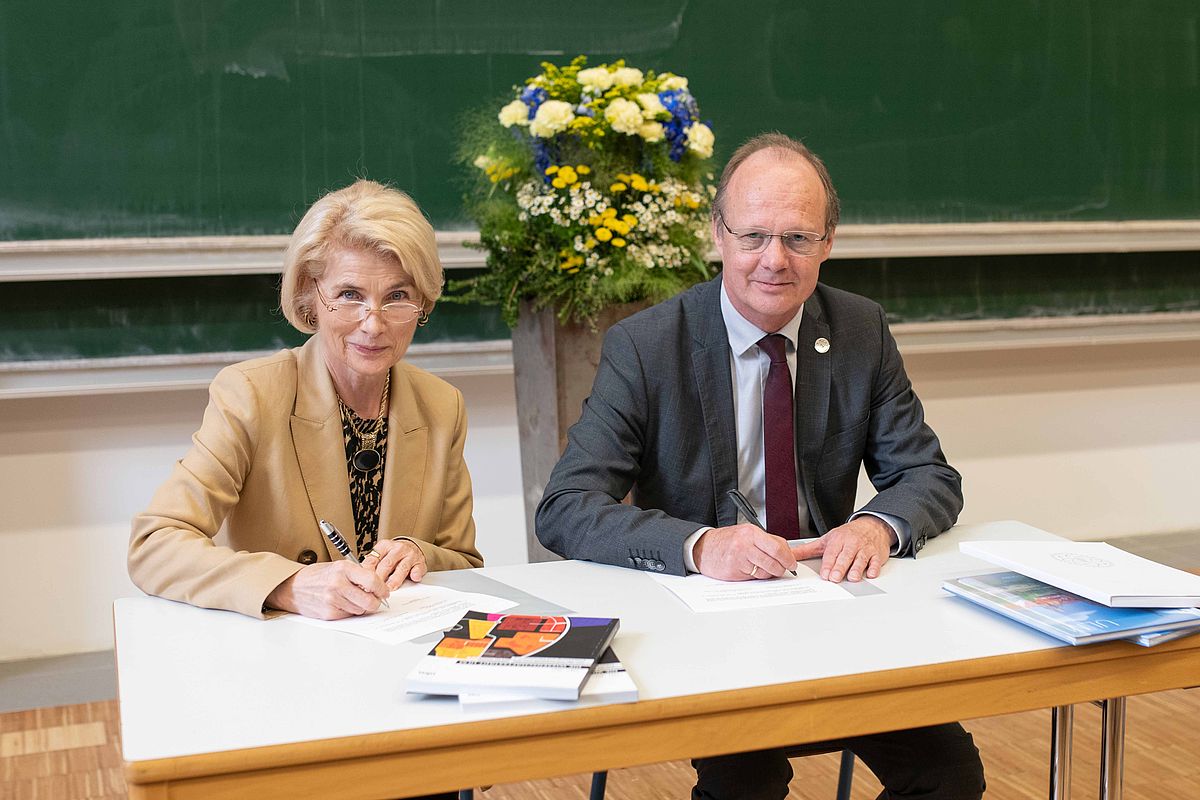 Beim „Welcome Event“ unterzeichneten die Rektorin der UFU Prof. Dr. Maria Pryshlak und der Ulmer Universitätspräsident Prof. Michael Weber ein Memorandum of Understanding. Die Universitäten vereinbarten weitere Zusammenarbeit und Unterstützung ukrainischer Studenten in Studienangeboten sowie Bildungsprogrammen.