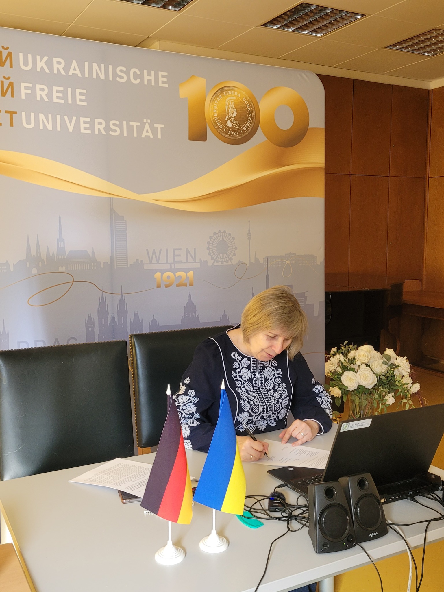Angesichts der aktuellen Umstände fand die Unterzeichnung im Online-Format statt. Seitens der Ukrainischen Freien Universität nahm Rektorin Prof. Larysa Didkovska an der Beglaubigungszeremonie teil, seitens der Taras-Schewtschenko-Luhansk-Nationaluniversität – Rektorin Prof. Olena Karaman.
