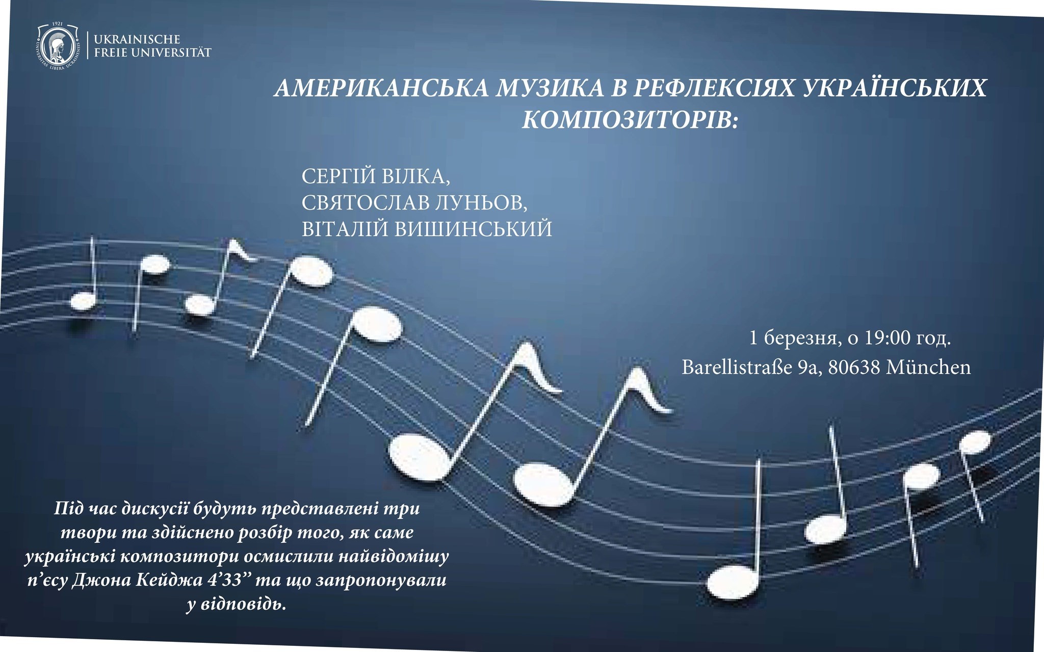 У середу, 1 березня о 19.00 в УВУ, відбудеться дискусія по творчості українських композиторів, Сергія Вілка, Святослава Луньова, і Віталія Вишинського з американським композитором Джоном Кейджем.У дискусії будуть представлені три твори та здійснено розбір того, як саме українські композитори осмислили найвідомішу п’єсу Джона Кейджа 4’33’’ та що запропонували у відповідь. Сучасна українська музична творчість не є явищем герметичним. Вона є частиною глобальної культури, – зокрема, перебуває під значним впливом інонаціональних культур. Утім, українська музика має суб’єктний характер: у неї власне прочитання світового музичного досвіду, а відтак – пропонування оригінальних композиторських концепцій.Щиро запрошуємо!До події можна долучитись також онлайн за цим посиланням: https://us06web.zoom.us/j/85930740743?pwd=QThUWEtSamR4YWFJSDVValVSYUV1QT09