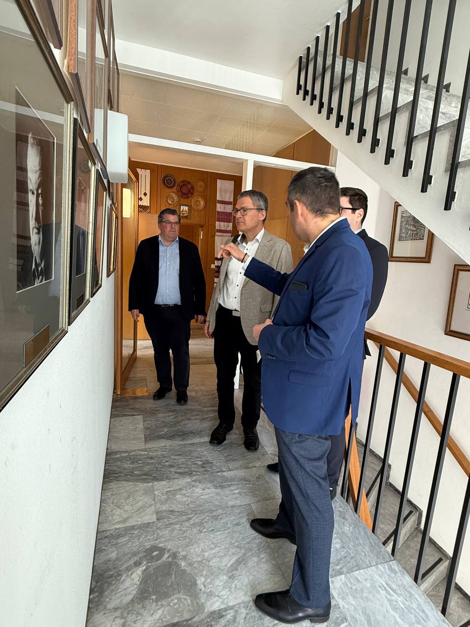 Der Kanzler der Ukrainischen Freien Universität, Dmytro Shevchenko, und Referent Dr. Roman Tyutenko führten den Gast durch die Räumlichkeiten der Universität. Anhand einzigartiger Archivdokumente, Publikationen der Diaspora aus den Jahren 1910–1950 sowie Beständen des Kunstfonds skizzierten sie die bewegte Gründungs- und Entwicklungsgeschichte der Ukrainischen Freien Universität.