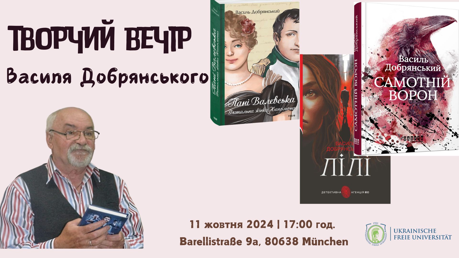 Творчий вечір відбудеться 11 жовтня о 17:00 (Мюнхен) у головній залі УВУ за адресою Barellistraße 9a, 80638 München.
