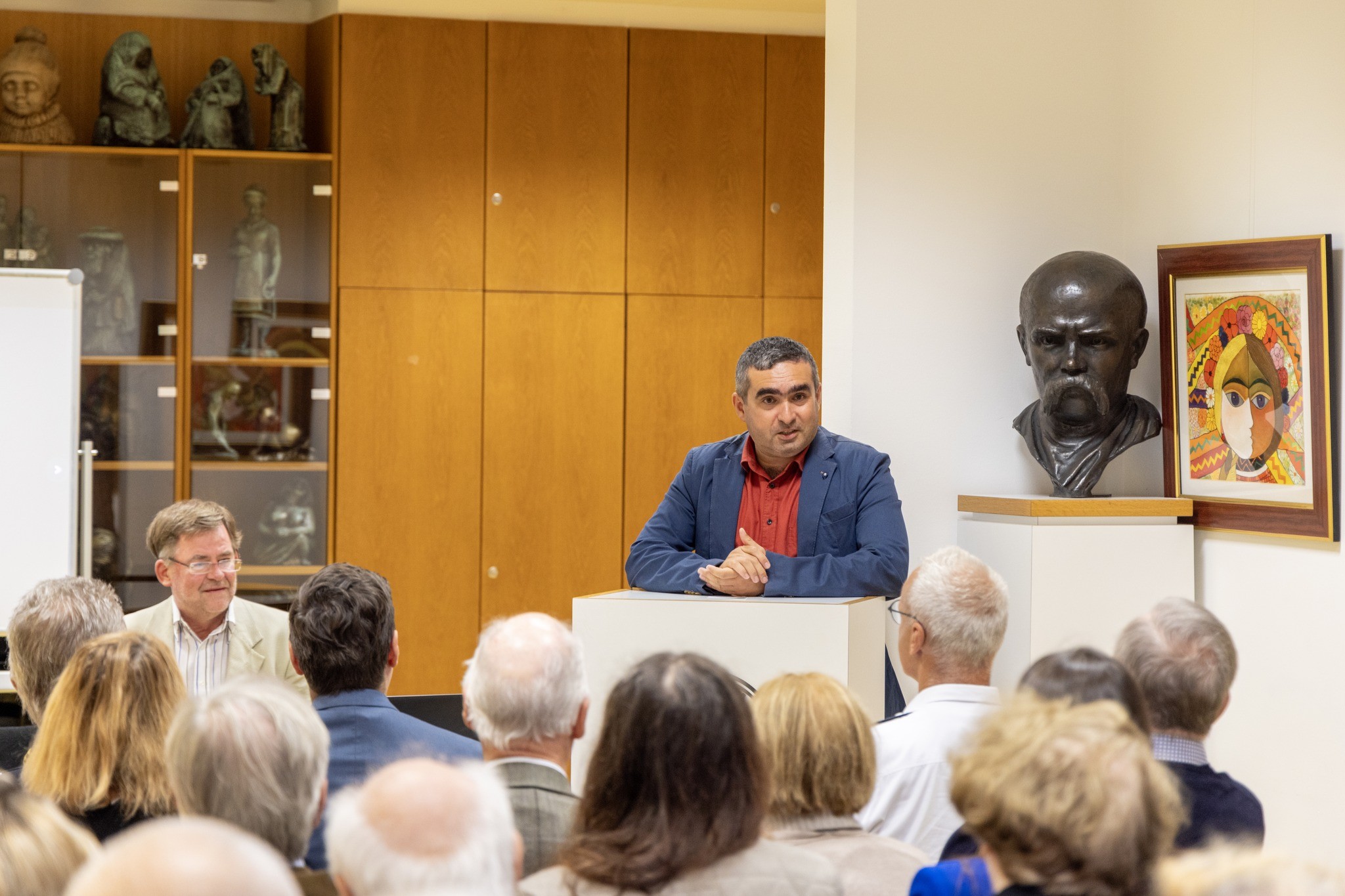 Hauptredner war Lukas Augustin, Präsident der Deutsch-Ukrainischen Gesellschaft für Wirtschaft und Wissenschaft (DUG). Herr Augustin präsentierte erstmals der Öffentlichkeit die Maßnahmen der DUG zur Rettung kultureller Werte in der Ukraine mit Unterstützung der deutschen Bundesregierung.